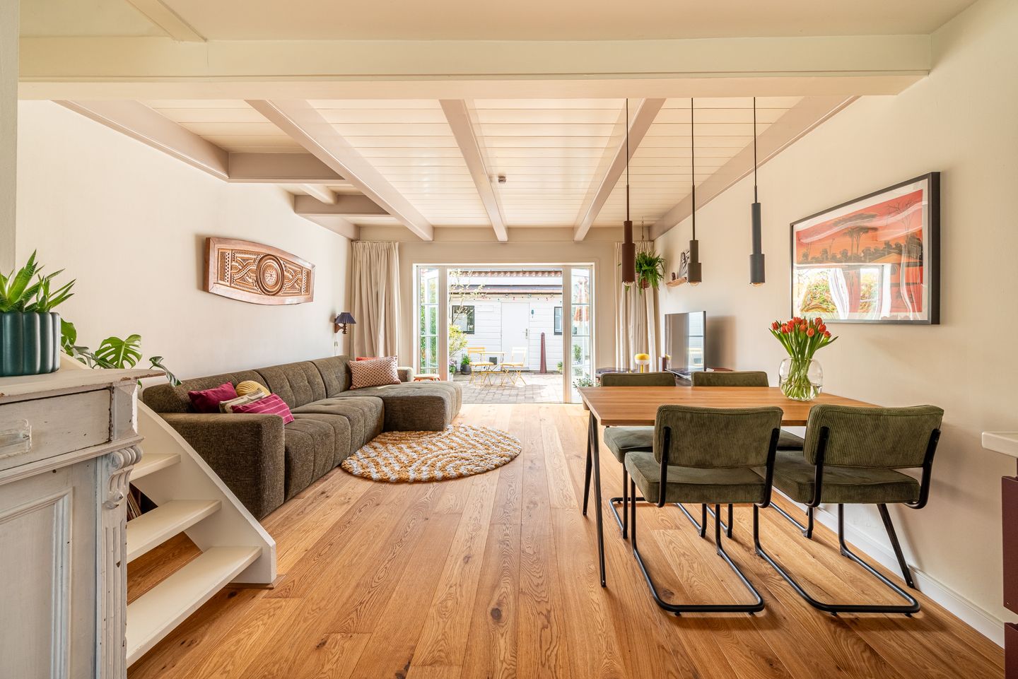 Een ruime en lichte woonkamer met twee openslaande deuren die toegang bieden tot de zonnige tuin van ca. 26 m², gelegen op het westen. Door de gunstige ligging heeft u het hele jaar door zon.