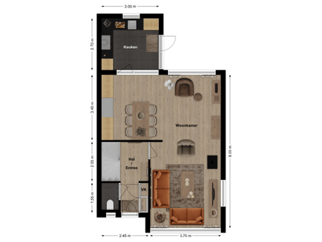 De entree ligt aan de voorzijde van de woning. Vanuit hier kom je in de L-vormige woonkamer, met aan de straatzijde een gezellig zitgedeelte met houtkachel en aan de achterzijde de eetkamer, direct bij de keuken. Hier vind je ook een vaste kastenwand met volop bergruimte én de Amerikaanse koelkast.