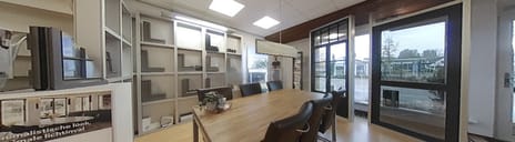 Overdekte entree en etalage naar de showroom, links deur naar de ‘tussenhal’ tussen de woning en de winkelruimte. Pantry met eenvoudige keukenopstelling, deuren naar het toilet (met fontein) en bergruimte met opstelling cv-ketel (Remeha Avanta, 2013, eigendom) en meterkast (met tussenmeter). Raam (met screen) aan de rechterzijde van het pand. Bureau-/werkplek achter in de ruimte.