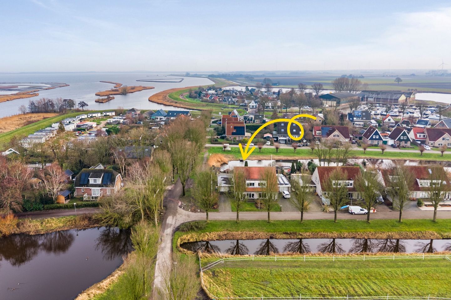 Gelegen op een hoekkavel, direct aan het water, midden in een uitzonderlijk waterrijke omgeving: dit is zo’n plek waar het landschap geen achtergrond is, maar onderdeel van het wonen zelf. Hier leef je tussen het Amstelmeer en de Waddenzee, in een licht zilte setting vol frisse lucht, ruimte en voortdurend wisselend licht. Water, lucht en openheid bepalen hier het ritme van de dag. Wie hier even uitzoomt, bijvoorbeeld via Google Earth, ziet direct hoe bijzonder deze omgeving is: landelijk, waterrijk, dorpse sferen en vergezichten die nooit vervelen.