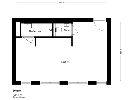 Via uw eigen voordeur betreedt u de woning. Direct bij binnenkomst valt de hoeveelheid licht van deze woning op. We beginnen bij de entree waar zich het separate toilet bevindt. Deze is zwevend uitgevoerd middels een wandcloset, volledig betegeld en voorzien van een fonteintje. Het plafond is hier verlaagd en voorzien van inbouwverlichting. Vanuit hier loopt u door naar het woongedeelte. Deze is van goed formaat en heerlijk licht door aanwezigheid van de diverse raampartijen. Het voelt hier lekker ruimtelijk aan. De strakke wandafwerking in combinatie met de mooie pvc-vloer maken het geheel af. Aan de andere zijde van het woongedeelte is de moderne open keuken gesitueerd. De keuken is van alle gemakken voorzien, zoals een koelkast met vriesvak, 4-pits elektrische kookplaat met afzuigsysteem, spoelbak met mengkraan, een combi-oven/magnetron, de plek voor uw wasmachine en diverse boven- en onderkastjes voor de nodige opbergruimte. Vanuit de keuken loopt u door naar het slaapgedeelte. Hier kunt u gemakkelijk uw bed plaatsen. Er is eveneens voldoende ruimte voor het plaatsen van een nachtkastje. De studio is zo in te richten dat u een mooie scheiding van wonen en slapen kunt creëren. Door naar de badkamer. Deze is van prima formaat, volledig betegeld en voorzien van een ruime inloopdouche met thermostatische mengkraan, een vaste wastafel met mengkraan en spiegel, alsmede een designradiator voor uw handdoeken. Uiteraard mag het verlaagd plafond met inbouwspots hier niet ontbreken.