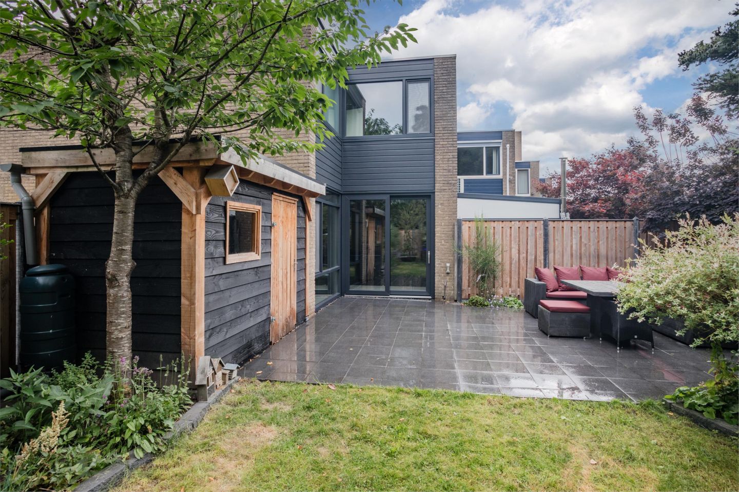 De achtertuin, gelegen op het zuiden, biedt een terras, een kleine vijver met waterval, een extra schuur en is volledig omheind met een schutting en achteringang.