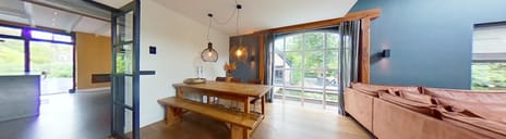 Binnen wacht u een royale, lichte woonkamer waar de vele ramen en de verhoogde nok met dakramen zorgen voor een overvloed aan daglicht en een schitterend uitzicht. Uiterst comfortabel door de vloerverwarming en sfeervolle (doorkijk)haard. De massief eiken vloer versterkt de warme uitstraling. In de uitbouw is een schitterende woonkeuken gerealiseerd: licht, ruim en voorzien van drie dubbele openslaande deuren naar de tuin. De keuken is uitgevoerd in een frisse, lichte kleurstelling en van alle moderne gemakken voorzien.