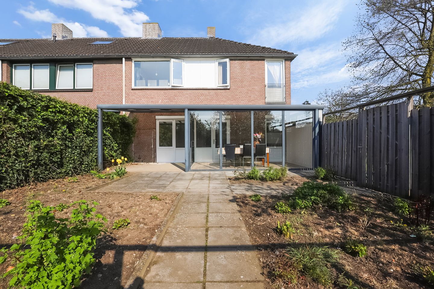 Via de serre bereik je de op het zuiden gelegen achtertuin met een combinatie van bestrating en groenperken. Onder de overkapping geniet je van een beschut terras, ideaal om het hele jaar door buiten te zitten. De tuin beschikt over een praktische achterom.