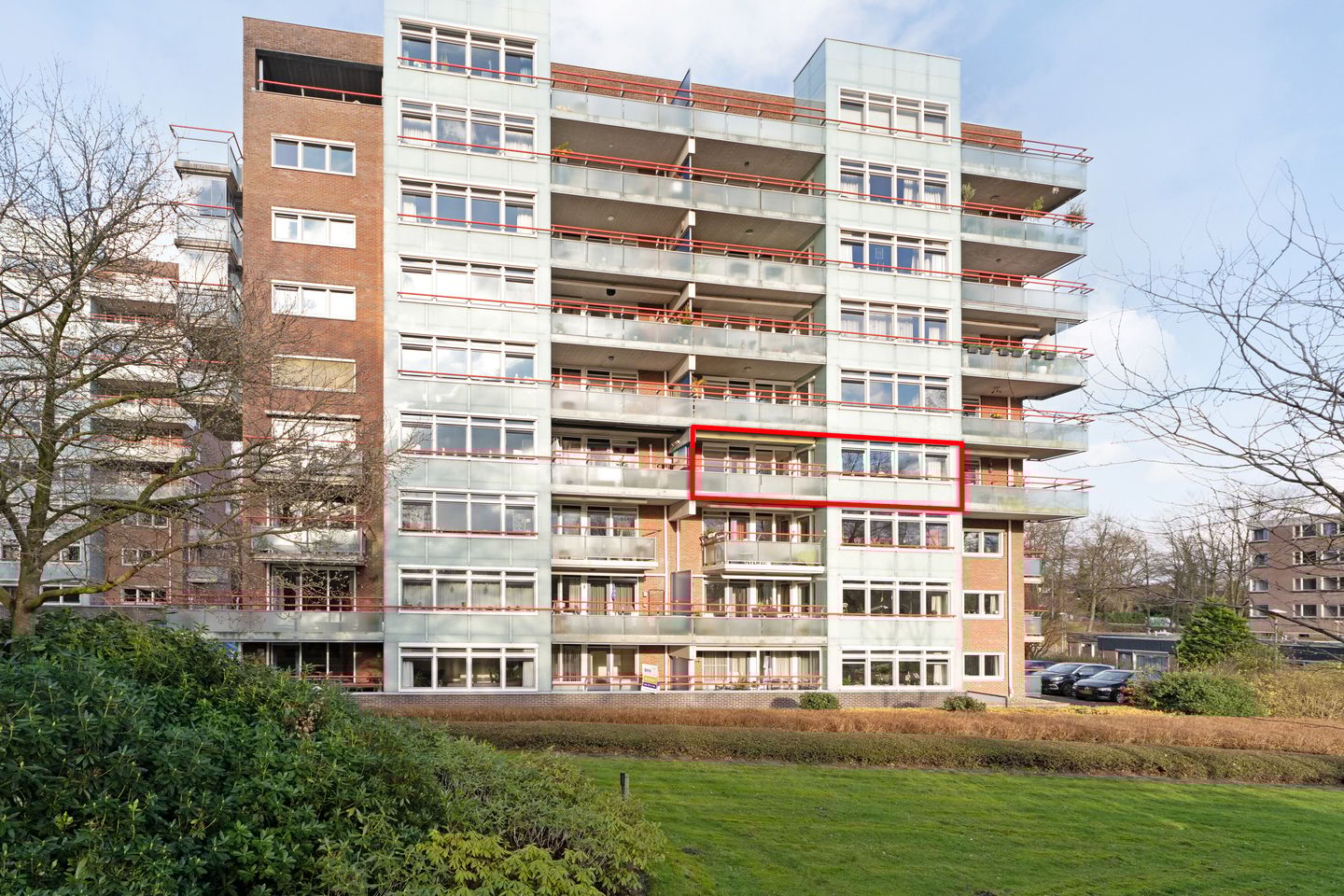 Entree, hal en een moderne toiletruimte met een fonteintje. Ruime woonkamer met vrij uitzicht en een deur naar het op het Zuiden gelegen balkon met elektrische zonwering en screens. Halfopen in 2014 vernieuwde en modern uitgevoerde keuken die beschikt over een kookplaat en een RVS afzuigkap. Vanuit de keuken is de bijkeuken bereikbaar met de opstelling voor de was apparatuur, de Nefit HR CV-ketel en bergruimte. Vanuit de hal zijn de twee slaapkamers en de moderne badkamer bereikbaar. De grote slaapkamer beschikt over een rechtstreekse deur naar deze badkamer en het balkon. De naast de woonkamer gelegen slaapkamer is ideaal als logeer- en/of studeerkamer. De vernieuwde ruime badkamer is voorzien van een inloopdouche met regendouche en een dubbel wastafelmeubel met veel kastruimte. Het appartement is voorzien van een eiken planken vloer.