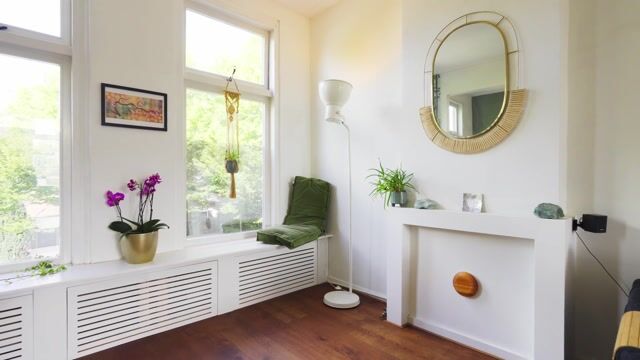 De L-vormige living voelt direct als een uitnodigende leefruimte. Grote raampartijen aan beide zijden zorgen voor veel daglicht en uitzicht op het groen in de straat. De houten vloer, rustige kleuren en sfeervolle details creëren een ontspannen en huiselijke sfeer. Aan de achterzijde bevindt zich het eetgedeelte met openslaande deuren naar het ruime balkon. Dankzij de ligging op het zuiden geniet je hier vrijwel de hele dag van de zon.
