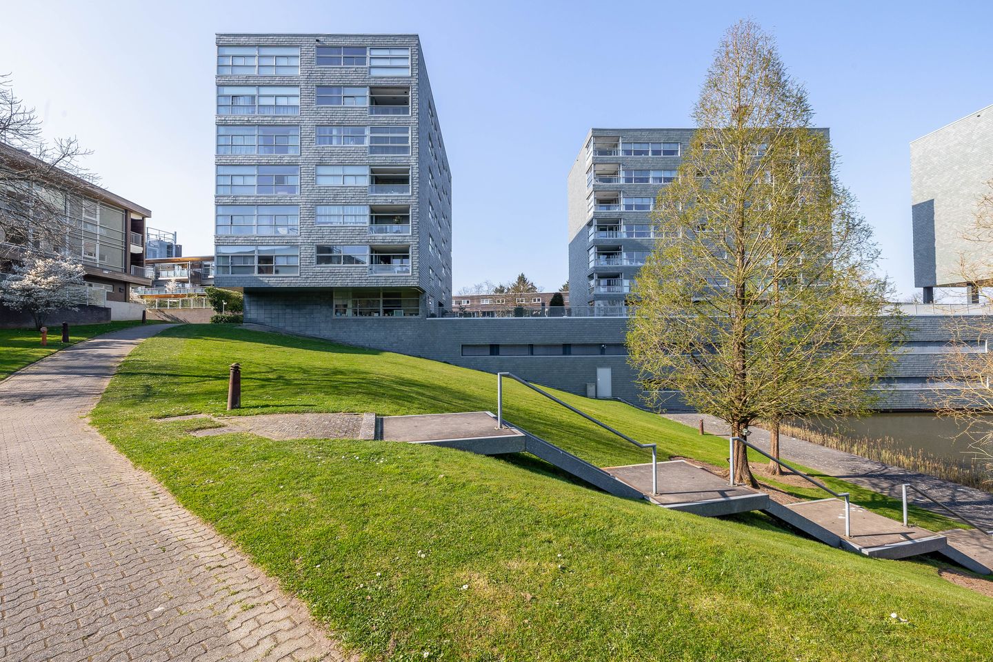 In Park Sonswijck zie je meerdere bordjes die verwijzen naar huisnummer 14-112. Deze bordjes verwijzen je naar de entree van ‘Terra Montis’, een fraai appartementengebouw. Er is een overdekte entree, die toegang geeft tot de gezamenlijke hal. Hier zijn de trap en lift richting de parkeergarage, bergingen en de bovengelegen verdiepingen.