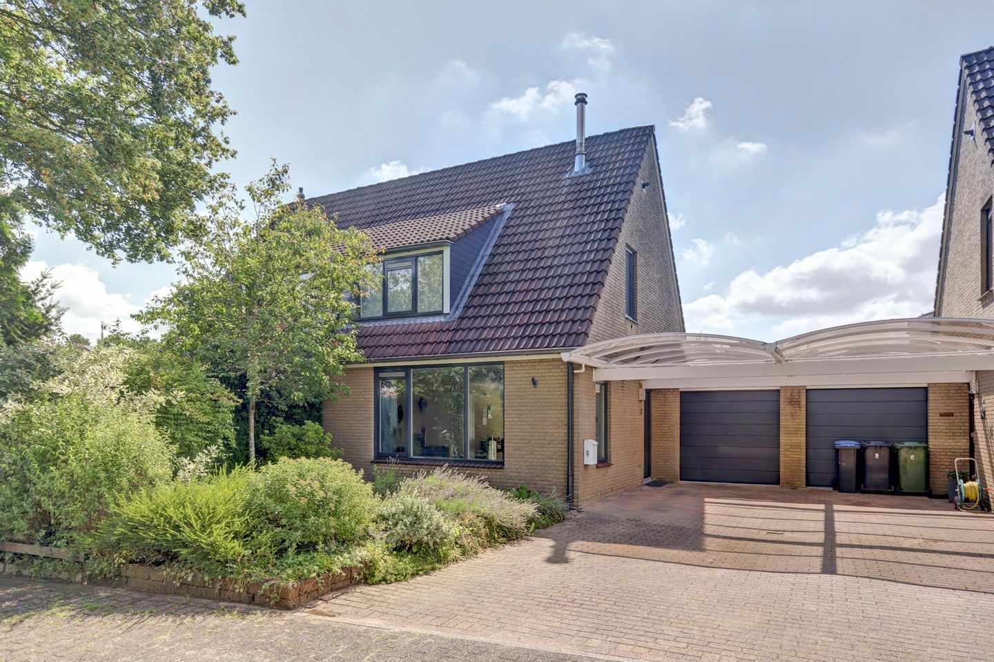 De garage met elektrische deur en Solatube biedt volop ruimte en comfort. Parkeren kan op eigen terrein én in de straat: 1 auto in de garage, 2 op de oprit/carport en 1 op de openbare weg voor het huis – in totaal 4 parkeerplekken.