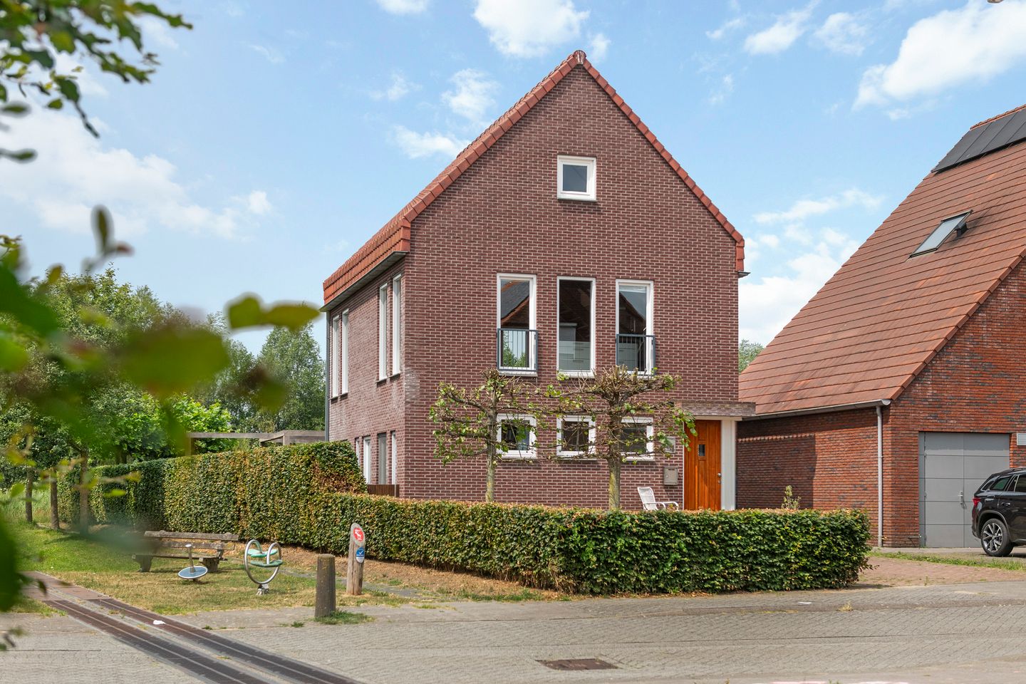 De diepe, zonnige achtertuin ligt op het westen en sluit perfect aan op het open karakter van de woning. U vindt hier een ruime overkapping, een houten chalet en een extra fietsenberging onder de buitentrap. Het gevoel van vrijheid, rust en ruimte zet zich hier naadloos voort.