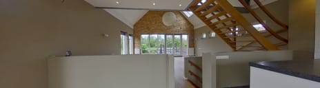 Op de eerste verdieping bevindt zich de hoge, lichte living met vide. De ruimte is voorzien van eikenhouten vloerdelen, grote raampartijen met panoramisch uitzicht, elektrische dakvensters en een airco-installatie. Openslaande deuren geven toegang tot een zonnig terras met buitentrap naar de tuin. De moderne open keuken beschikt over een natuurstenen aanrechtblad, luxe inbouwapparatuur en een leistenen vloer. Een tweede hardhouten trap leidt naar de bovenste verdieping.