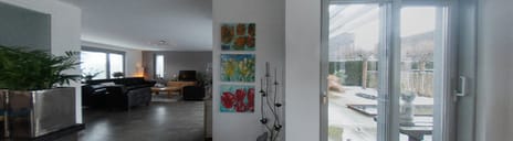 Via de entree met hal, toilet en open trap kom je in de royale woonkamer. Grote schuifpuien aan zowel het zit- als eetgedeelte zorgen voor een prachtige verbinding met buiten en laten het daglicht rijkelijk binnenstromen.
