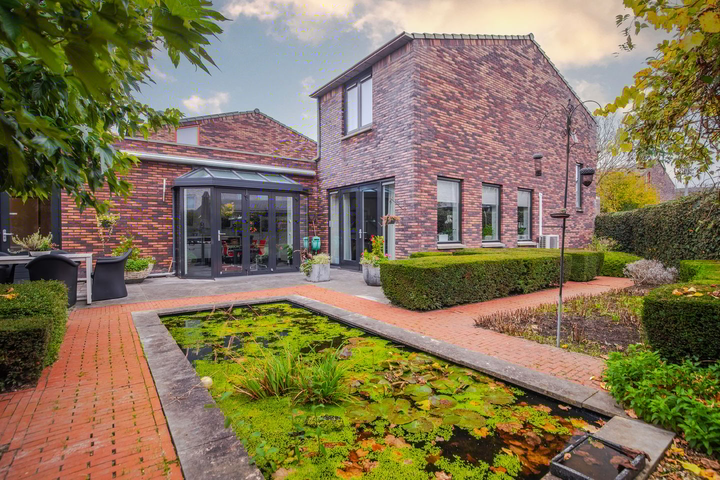 De tuin is onder architectuur aangelegd en zoals u op de foto's wellicht al heeft gezien is er een strakke vijver aangelegd met dichtbij de erker een rechthoekig terras waar een meer dan riante tuintafel geplaatst kan worden. Vlakbij de toegangsdeur tot de carport staat een keurig onderhouden vrijstaande houten berging.