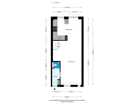Entree met meterkast en toilet. Vanuit de hal stap je de ruime woonkamer binnen, met hoge plafonds, betonlook afwerking en zichtbare balken. Aan de voorkant bevindt zich het zitgedeelte, richting de achterzijde loopt de woonkamer door naar de woonkeuken. De woonkeuken ligt aan de tuinzijde en is een fijne leefruimte met plaats voor een grote eettafel. De keuken staat in een hoekopstelling en is uitgerust met een groot gasfornuis, open kastenwand en donkerkleurige fronten. Via een deur bereik je de diepe achtertuin.