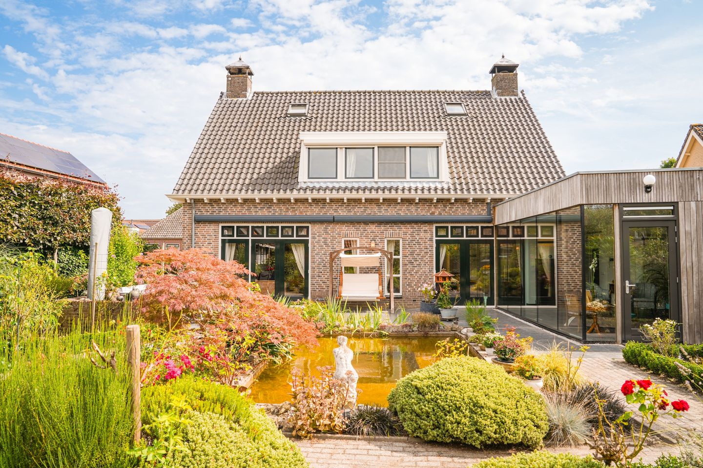 De woning is voorzien van een prachtig aangelegde en goed onderhouden tuin. Aan de achterkant van de woning grenst een ruim terras, daarachter ligt een vijver die is omringd door mooie beplanting. Speels aangelegde tegels en plantenborders wisselen elkaar af. Helemaal achterin de tuin, tussen de garage en de schuur in, bevindt zich nog een kippenren. De tuin biedt een schuur en een dubbele garage met vliering van respectievelijk 23m2 en 37m2. Op het dak van de schuur liggen zonnepanelen. Het perceel biedt vier parkeerplaatsen; één voor de ingang van de aanbouw en één naast de garage aan de zijkant van de woning. Natuurlijk is het mogelijk 2 auto’s in de garage te plaatsen.
