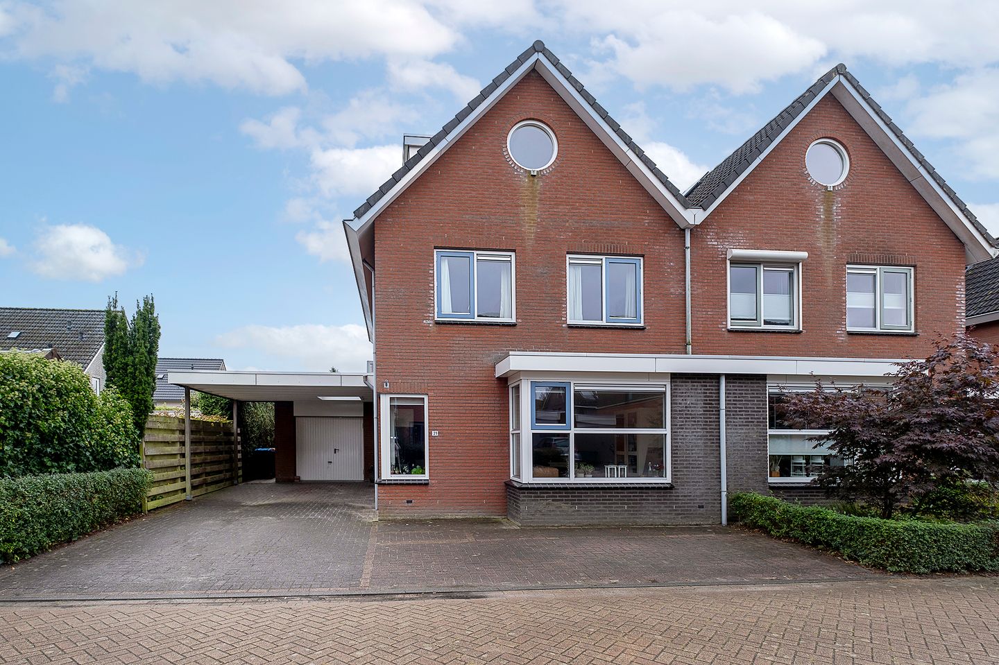 De aangebouwde garage (ca. 20 m²) is bereikbaar vanuit de bijkeuken en biedt voldoende bergruimte. De carport (ca. 24 m²) met lichtkoepel is ruim bemeten. Op de ruime oprit is er voldoende ruimte om meerdere auto's op eigen terrein te parkeren.