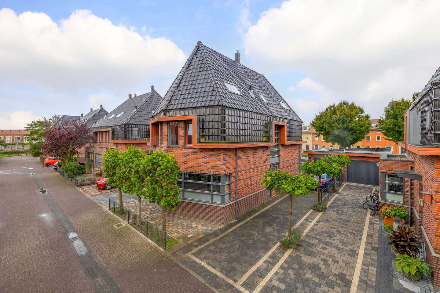 Wat aan de voorkant opvalt, zijn de mooie leibomen in de voortuin. Ook is er aan twee kanten een oprit met maar liefst plaats voor 4 auto's. Het sierhekwerk dat je ziet, staat ook bij het laatste stuk van de lange oprit. Bij de lange oprit staat een garage met elektra.