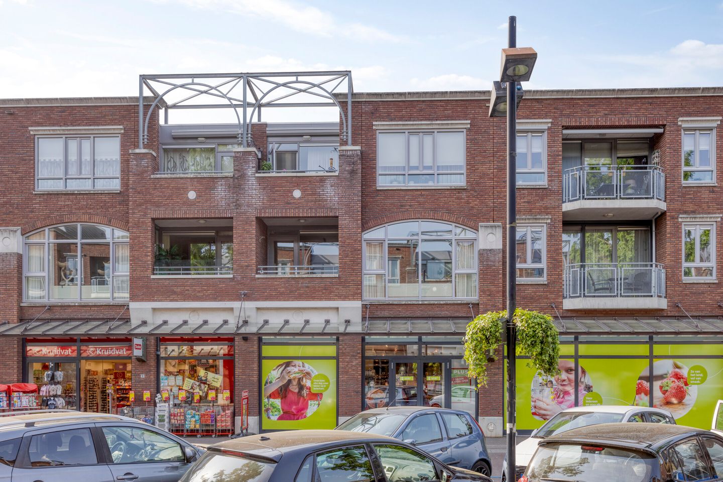 Het balkon is met hard houten vlonderplanken bevloerd. Vanuit het balkon is er mooi zicht op het Burgemeester Ruttenplein met diverse winkels en supermarkten.