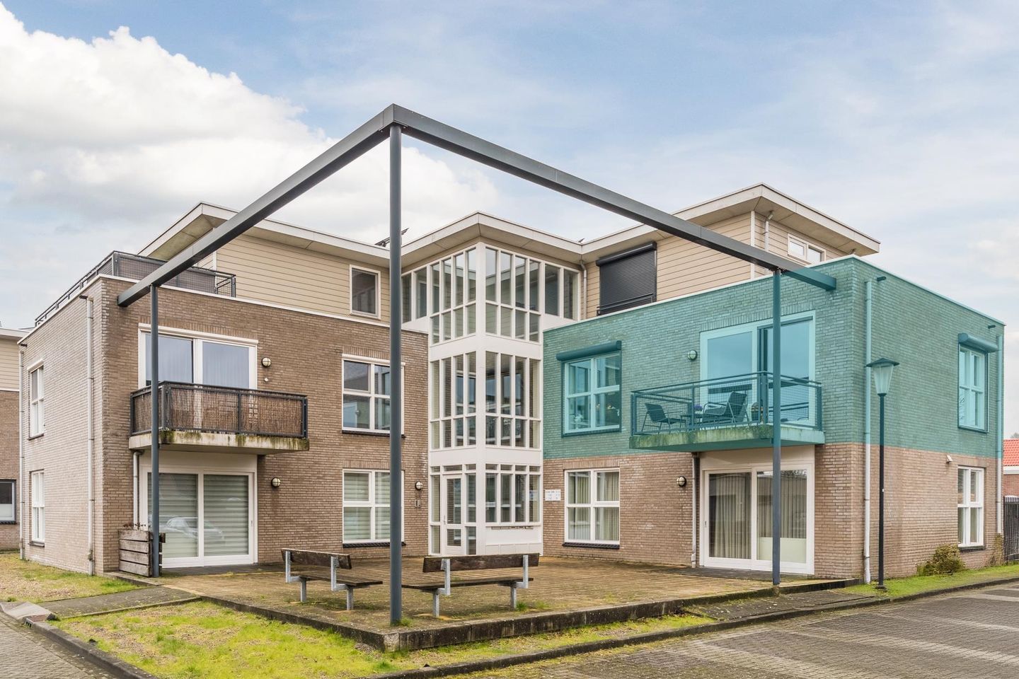 Aan de straatzijde bevindt zich de centrale entree van het appartementencomplex.