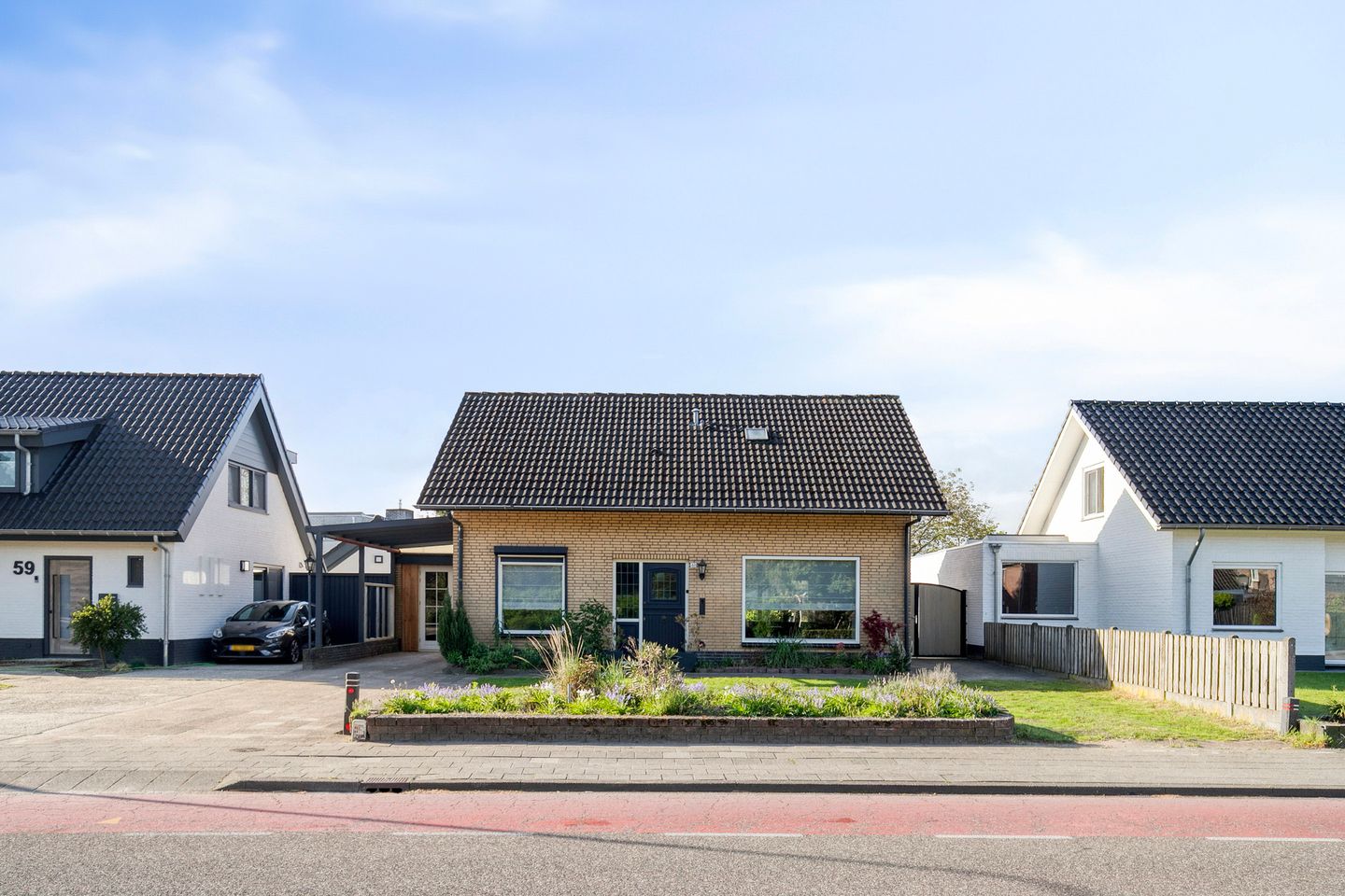 Voorzijde met oprit voor meerdere auto’s, carport, dubbele poort met achterom en onderhoudsvriendelijke tuin.