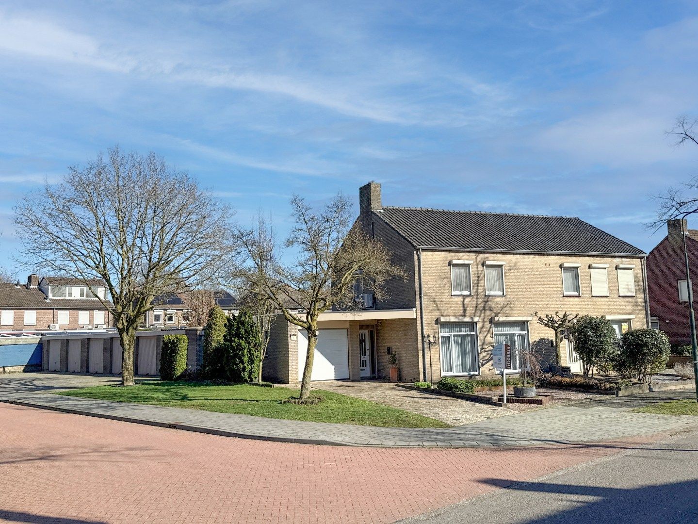 De sierverharding die hier ligt, is doorgelegd als pad langs de garages tot aan de houten tuinberging die zich achter in de tuin bevindt.