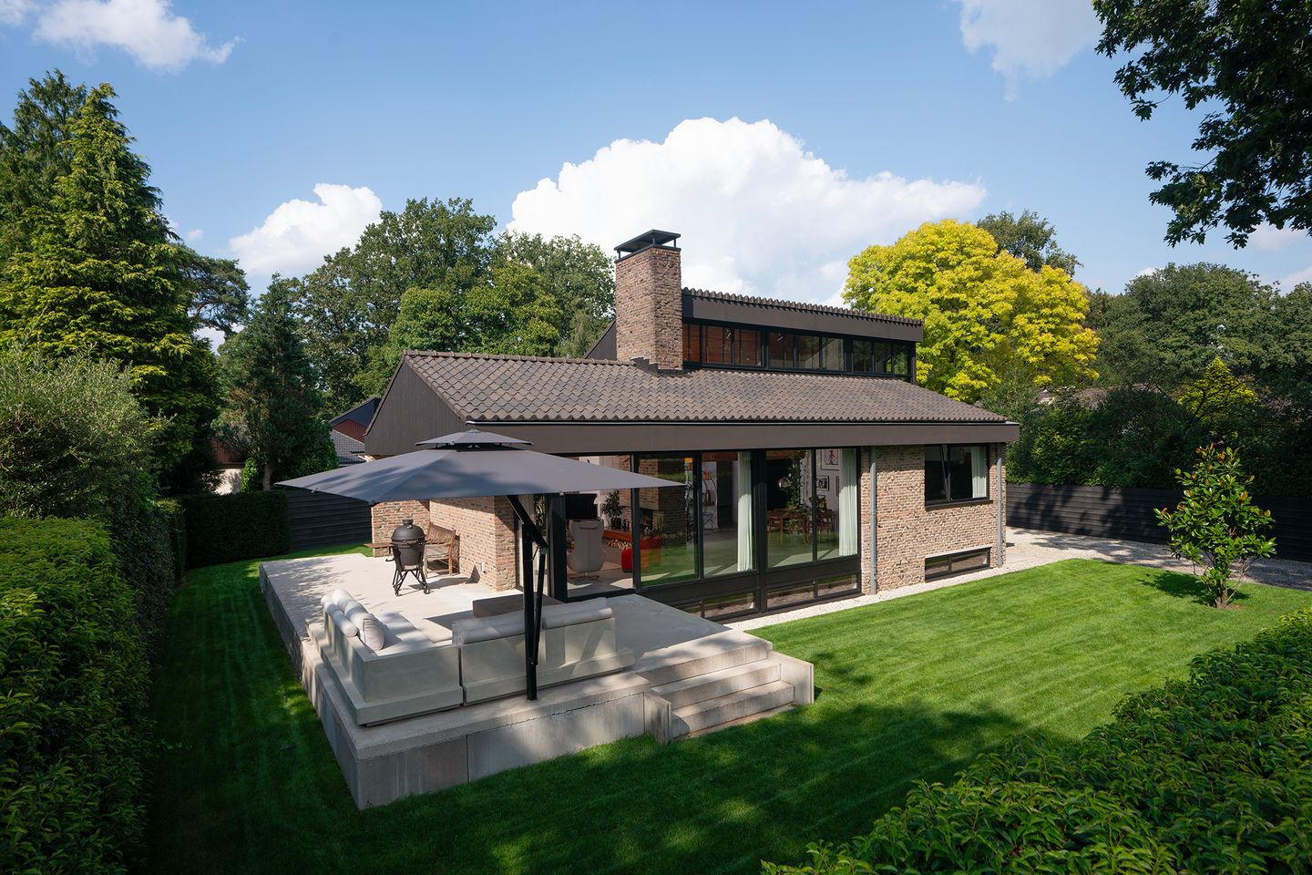 Rondom het huis ligt een prachtig aangelegd grasveld dat de villa omarmt, met een ruime oprit die leidt naar de garage met carport. Vanuit de woonkamer en het verhoogde terras geniet je van een fenomenaal uitzicht over oude bomen en statige huizen. Het terras is een bijzonder hoogtepunt: speciaal ontworpen zodat je rechtstreeks vanuit de woonkamer naar buiten kunt lopen, waardoor binnen en buiten naadloos in elkaar overgaan.