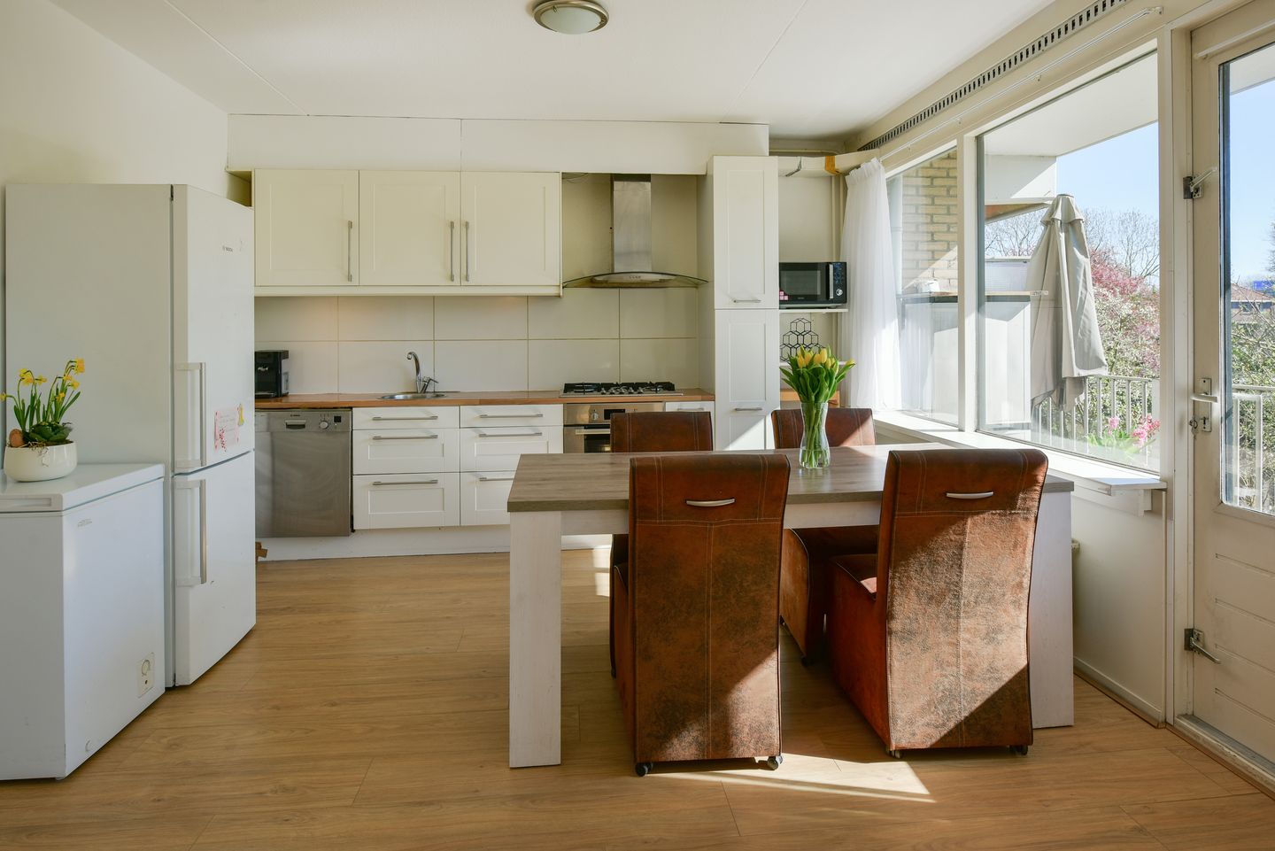 Layout apartment: spacious vestibule, spacious hall with extensive meter cupboard (fiberglass connection is present), toilet with fountain, bright and sunny living room with unobstructed views, bright kitchen with various appliances including 5 burner gas hob, extractor hood, oven and dishwasher. Door to the large balcony.