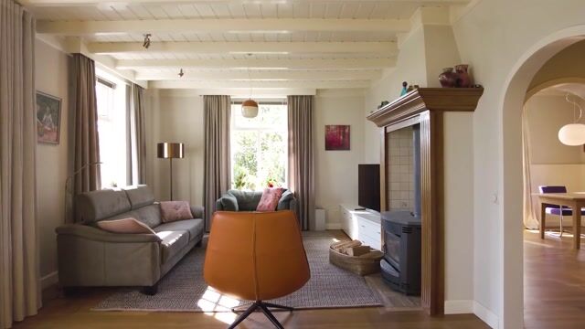 De woonkamer is licht en ruim, met openslaande deuren naar buiten, rondom zicht op het groen, een op maat gemaakt tv-meubel en een houtkachel. De landelijke keuken is sfeervol ingericht en voorzien van een terrazzo werkblad, dubbele keramische spoelbak, afzuigkap en een inductiekookplaat (2026). Het karakteristieke balkenplafond en de ruime voorraadkast maken het geheel compleet.