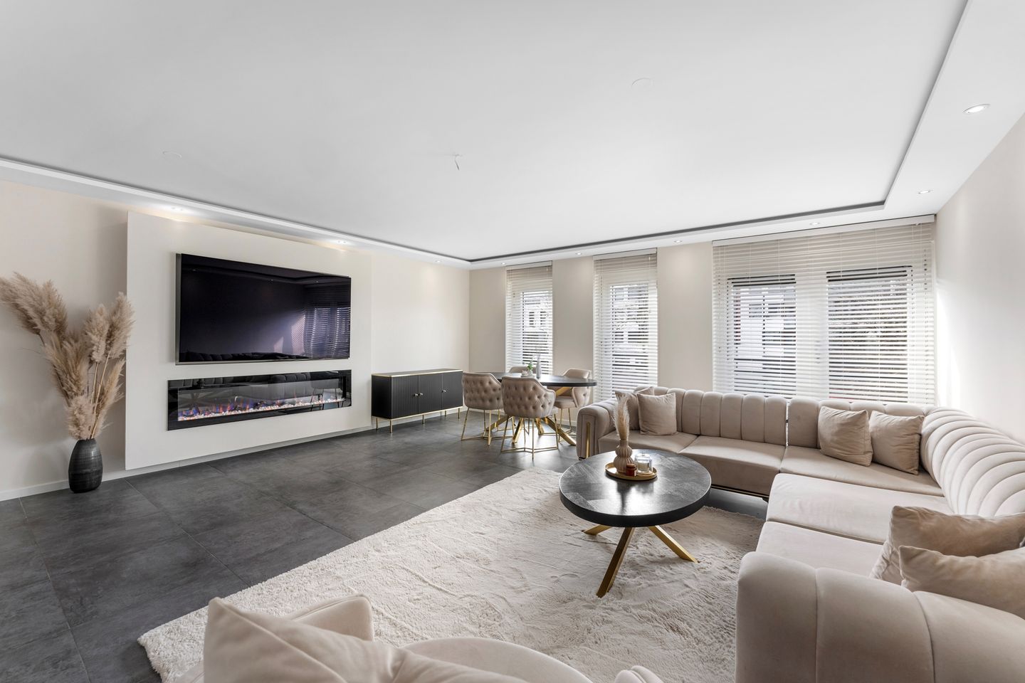 Aan het einde van de hal is de ruime en lichte woonkamer met een prachtige cinema-wal en sfeerhaard. Door de vele ramen is de woonkamer heerlijk licht!