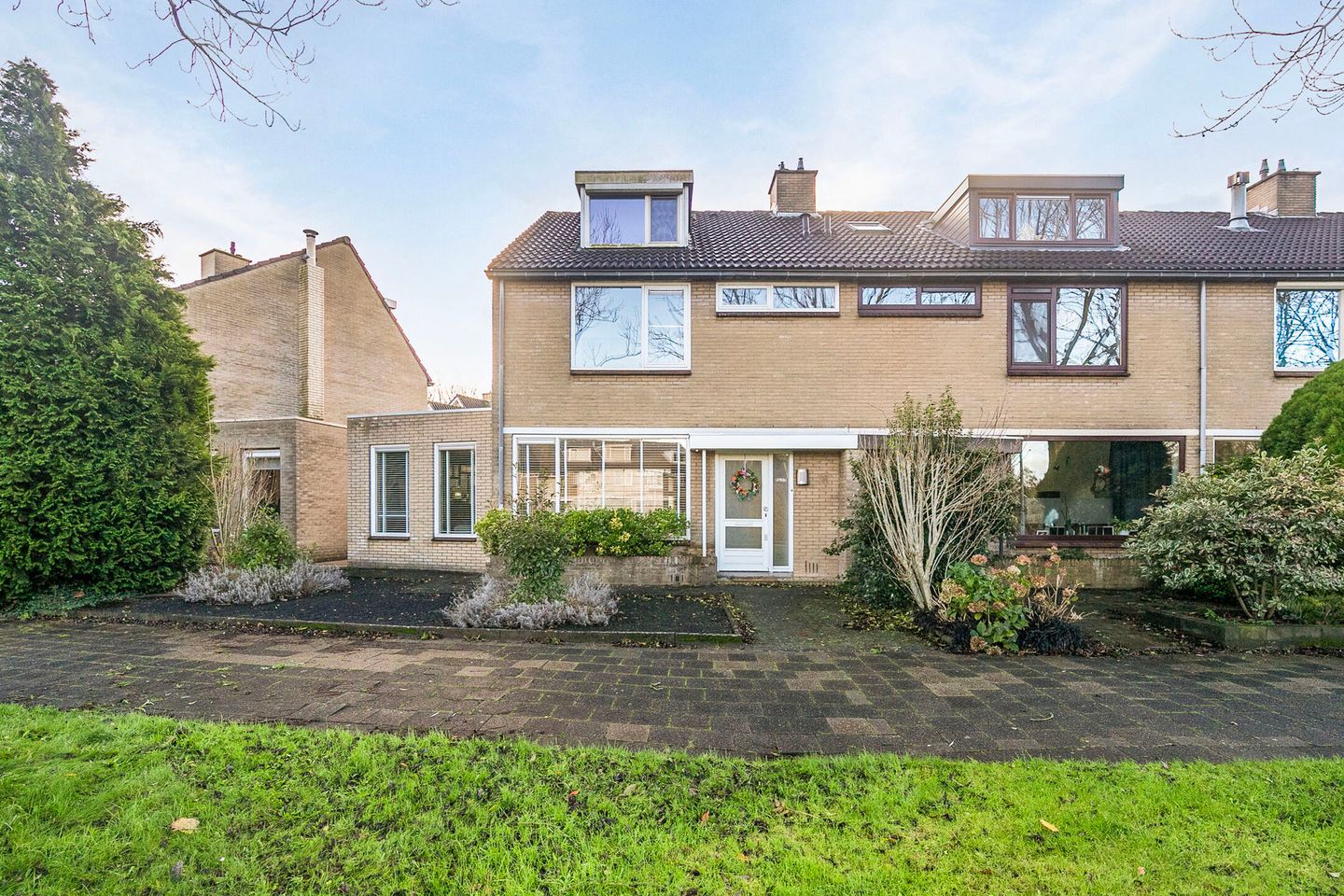 Voortuin met sierbestrating en sierbeplanting. De woning is gelegen aan een autovrije straat, waardoor het een veilige en rustige plek is voor gezinnen met kinderen. Parkeren kan gemakkelijk in de nabijgelegen parkeervakken.