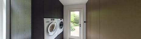 De bijkeuken is voorzien van maatwerk kasten, aansluitingen voor wasmachine en droger, cv-opstelling en een loopdeur naar de tuin.