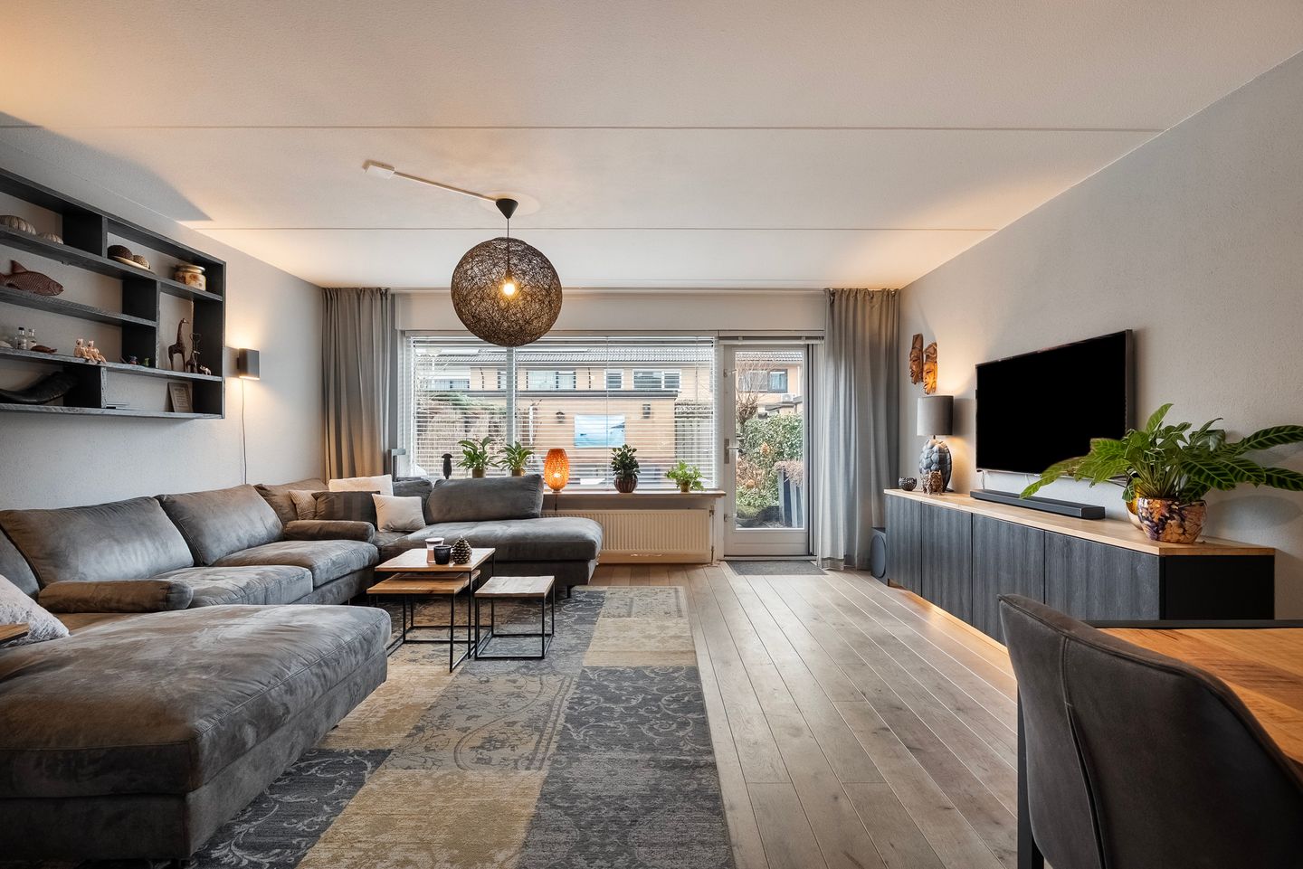 Uitgebouwde tuingerichte woonkamer (ca. 32 m2) voorzien van houten vloerdelen en een handige trap-/voorraadkast. Middels een loopdeur heeft u toegang tot de zonnige achtertuin.