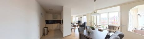 Deze licht en ruime leefruimte biedt plek voor een gezellige zithoek én een sfeervolle eethoek. Wat deze ruimte écht uniek maakt? Dat is de serre! Deze ruimte is voorzien van openslaande ramen waardoor u vanuit binnen van buiten kunt genieten.