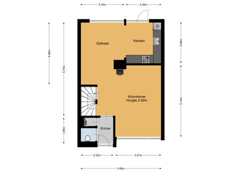 De woonkamer is een prettige leefruimte. De kamer is afgewerkt met een gestuukt plafond en een laminaatvloer. Aan de voorzijde is een groot raampartij, wat zorgt voor veel daglicht heeft in de kamer. U heeft in de woonkamer volop plek voor een royale zithoek waar u gezellig met uw gezin, familie of vrienden kunt vertoeven. Verder is de ruimte voorzien van de trapopgang naar de eerste verdieping en een praktische trapkast, handig voor uw voorraad en uw huishoudspullen.