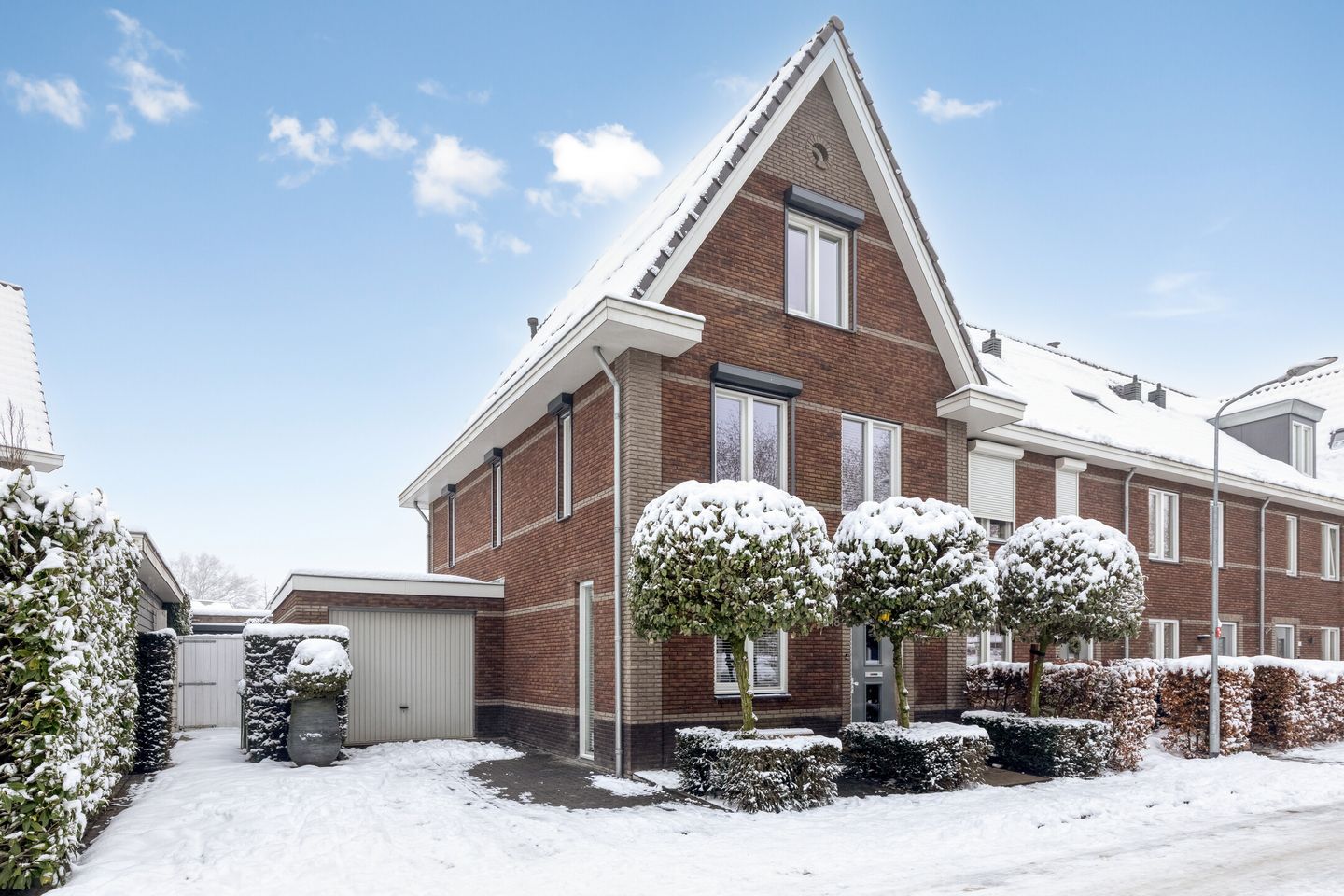 De strak aangelegde achtertuin is voorzien van een terras en diverse borders met beplanting en hagen. De aangebouwde garage is via een loopdeur vanuit de tuin bereikbaar en biedt volop ruimte. De veranda achterin de tuin maakt de tuin helemaal af en beschikt over heaters en automatische screens. Het heeft reeds een water- en gasaansluiting en voldoende ruimte om een royale tuinset te plaatsen. Een fijne plek waar u goed kunt vertoeven! Aan de voorzijde van de woning is een royale oprit aanwezig, waardoor het mogelijk is om uw auto op eigen terrein ruim te kunnen parkeren. De garage is eveneens via een elektrisch bedienbare kanteldeur te bereiken.
