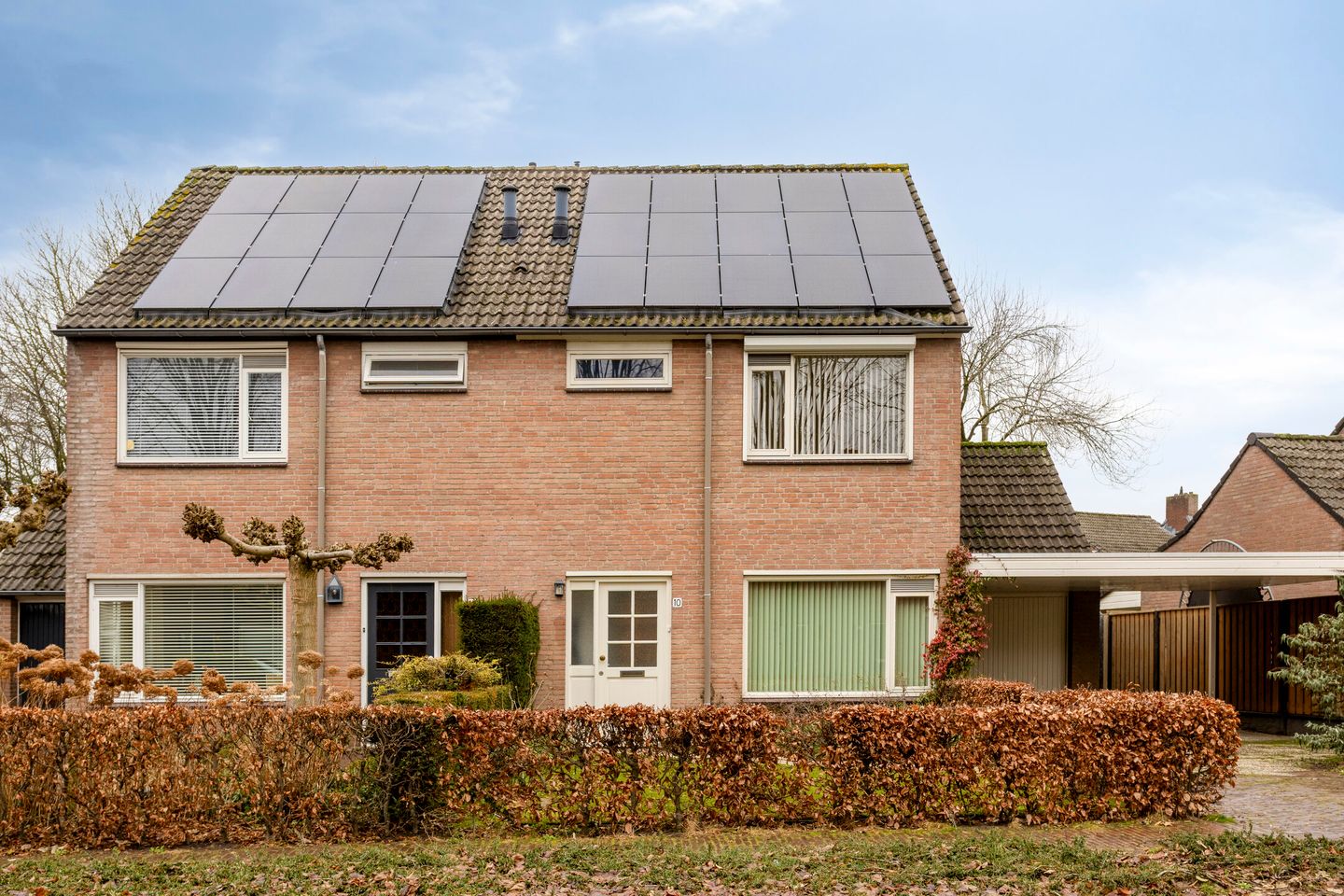 De voortuin heeft een ruime oprit met royale carport.