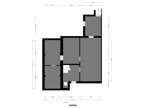 Souterrain: kelderhal (ca. 2.95 x 2.98) met plavuizenvloer en aansluitpunt wasmachine en droger, kelder I (ca. 7.88 x 3.78), kelder II (ca. 4.56 x 2.85), kelder III (ca. 4.15 x 2.85), kelder IV (ca. 3.58 x 2.87) met buitentrap naar tuin;