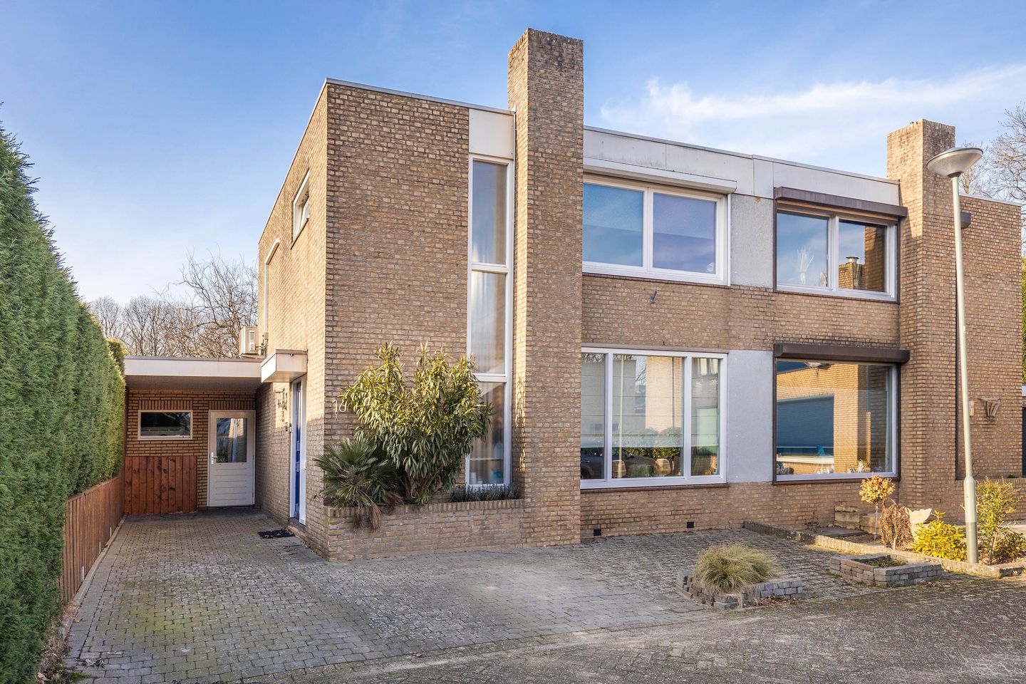 De woning heeft de voordeur gesitueerd in de zijgevel, aan de zijkant van de oprit met vervolgens de carport, alwaar ook een toegangsdeur aanwezig is voor rechtstreekse toegang naar de berging.