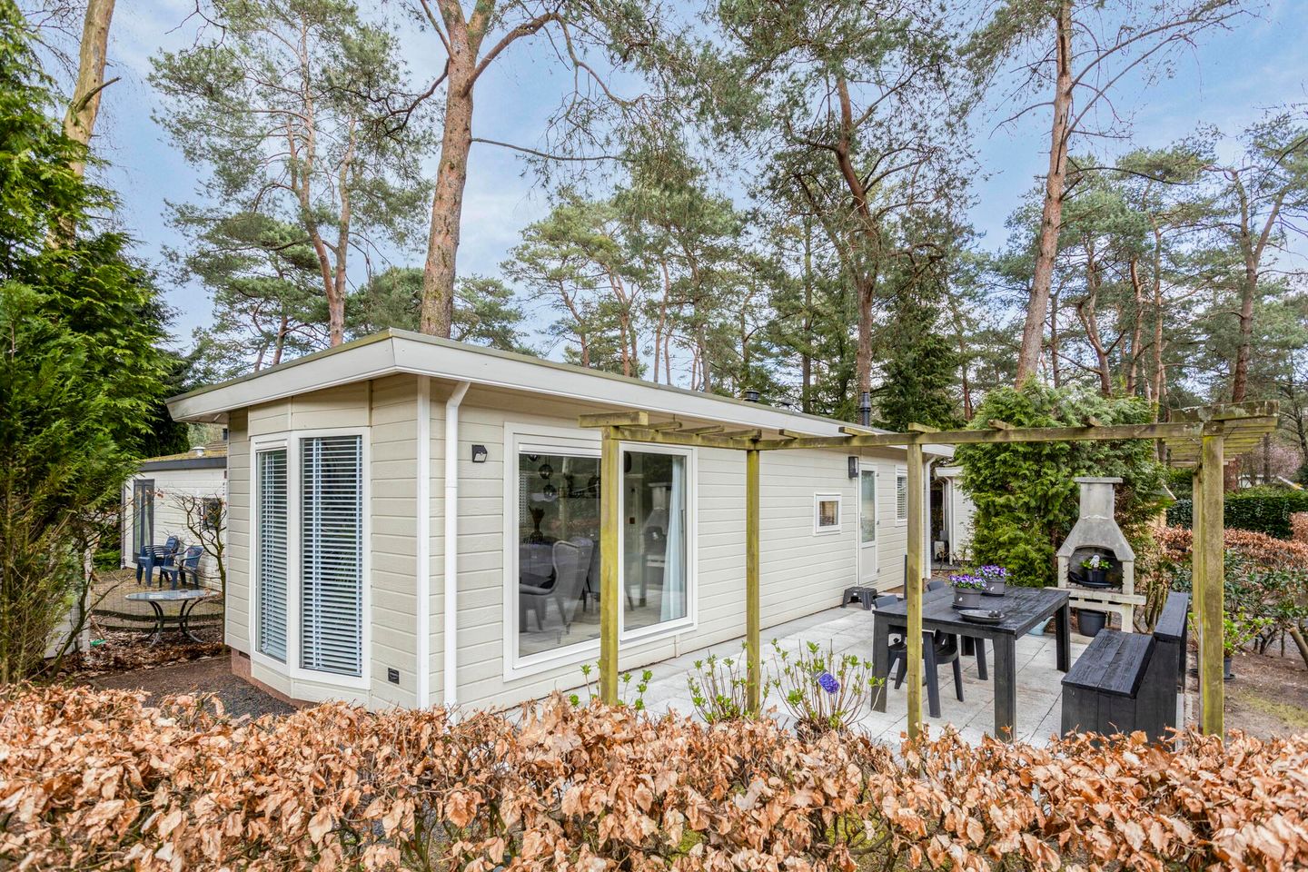 Deze prachtige recreatiewoning vindt u op EuroParcs te Beekbergen, gelegen op een perceel EIGEN GROND van 179m2.