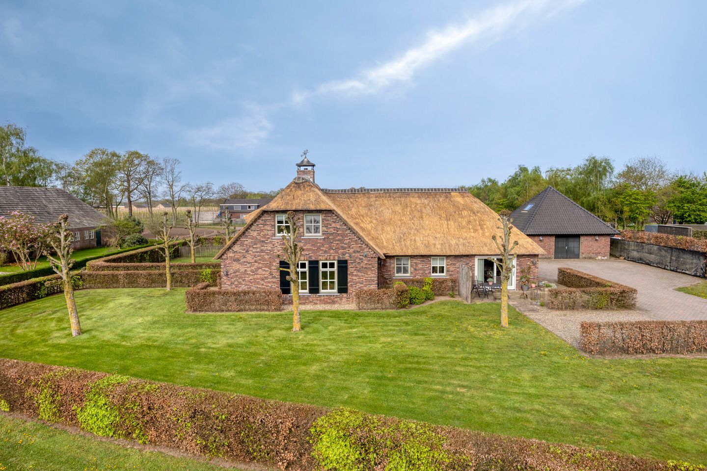 De riet gedekte kap, met schroefdak, is vernieuwd in het voorjaar van 2026.