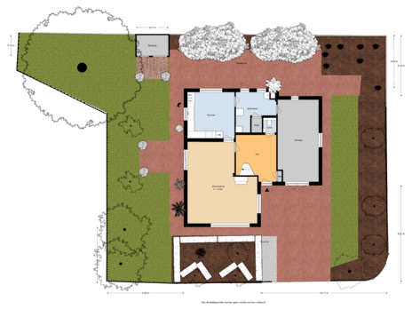 Rondom de woning ligt een keurig onderhouden en gevarieerd aangelegde tuin met sierbestrating, gazons, enkele bomen en volwassen struiken. De ruime voortuin heeft een oprit voor de auto.