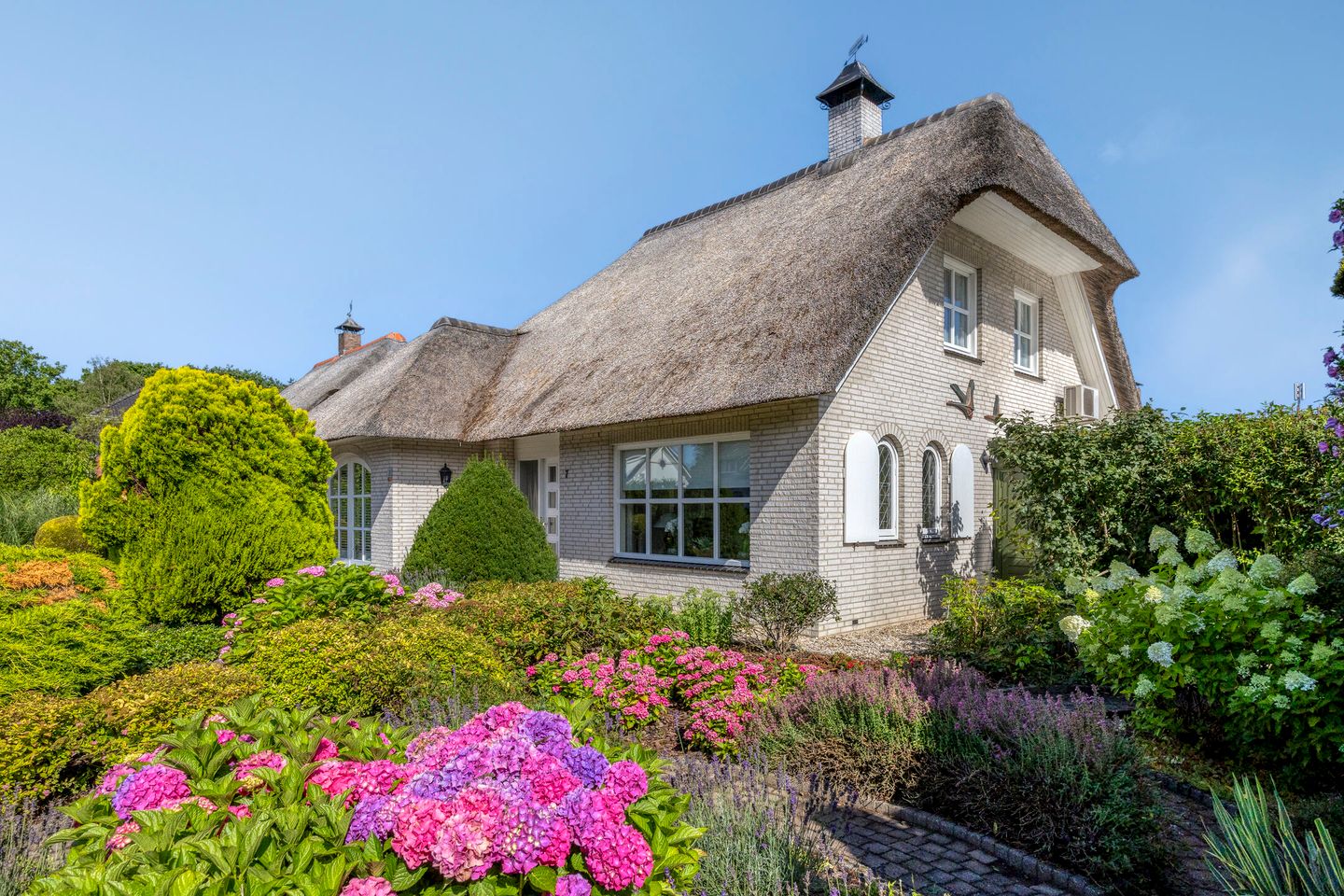 Aan de voorzijde van de woning ligt de echte verrassing: een prachtig aangelegde siertuin met slingerende paden, speels vormgegeven borders en een weelderige beplanting van bloeiende struiken en vaste planten. Deze tuin is met zorg ontworpen en biedt elke dag een ander uitzicht, met kleur en geur in elk seizoen.