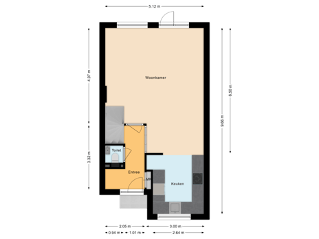 Indeling begane grond: entree, gang, wc, open aangebouwde keuken aan de voorkant in een U-vorm, met een open eetkamer en een open woonkamer.