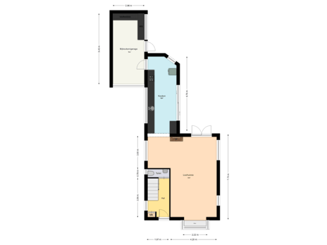 De bijkeuken/garage (ca. 18m²) is uitgerust met een elektrische Hormann-poort en een volledige keuken en biedt plaats voor een wasmachine/droger en een boiler voor warm water.