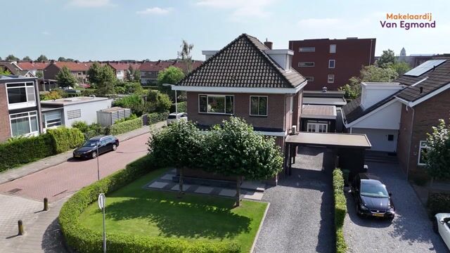 De voortuin is lekker ruim en groen. Een gazon en twee leibomen staan voor het huis en daarnaast heb je de oprit waar je royaal twee auto’s kan parkeren. Naast het huis is een zogenaamde carport voor onder andere de fietsen.
