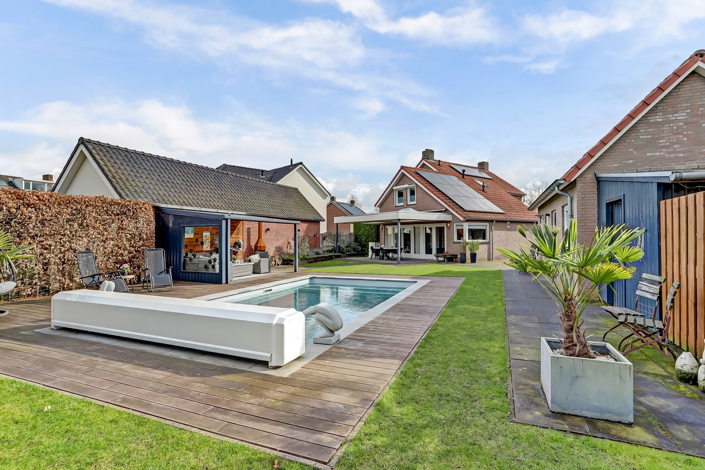 En het riante zwembad met elektrisch roldek en houten vlonder... wat een luxe!