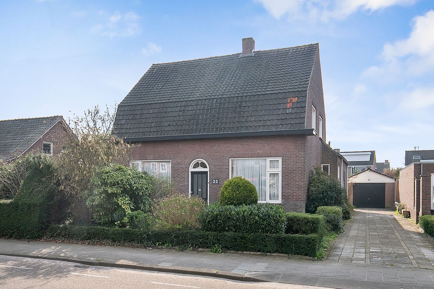 De lange oprit aan de rechterkant van het huis komt uit bij de vrijstaande, grote garage.