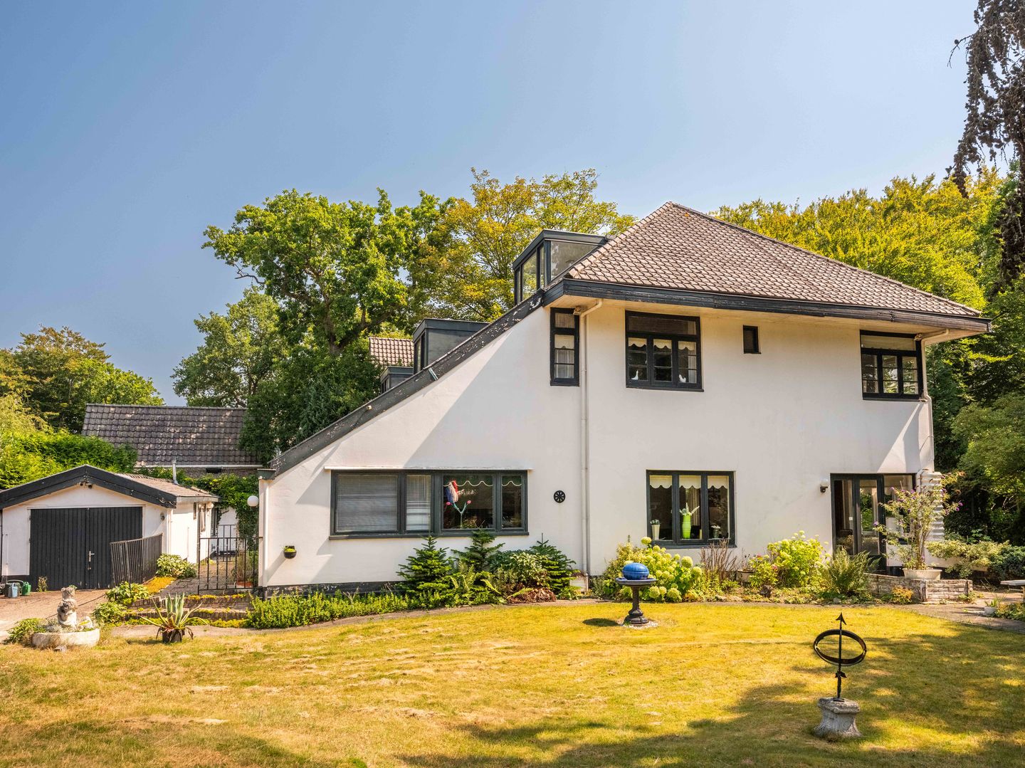 The driveway gives access to the plot. Here you will also find a large detached garage. Plenty of room for cars on private property. The villa is located on a spacious plot with beautifully landscaped trees and bushes all around.