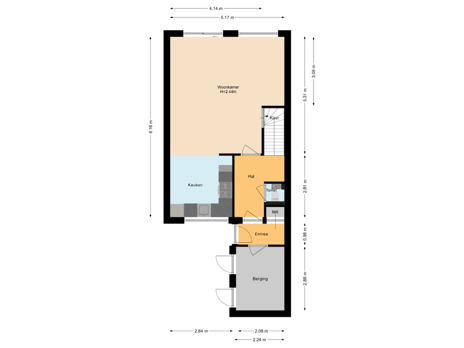 Achter de voordeur vinden we de entreehal, inpandige toegang tot de berging en toegang tot de centrale hal met aldaar het gastentoilet, de trapopgang naar de eerste verdieping en toegang tot de woonkamer met open keuken.