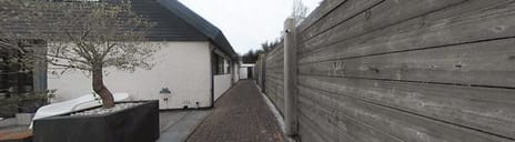 Buiten ligt een zonnige tuin rondom de woning, met meerdere terrassen en voldoende beschutting. Hier zit je vrij, zonder inkijk, en met ruimte om verschillende plekken in de zon of schaduw te kiezen.