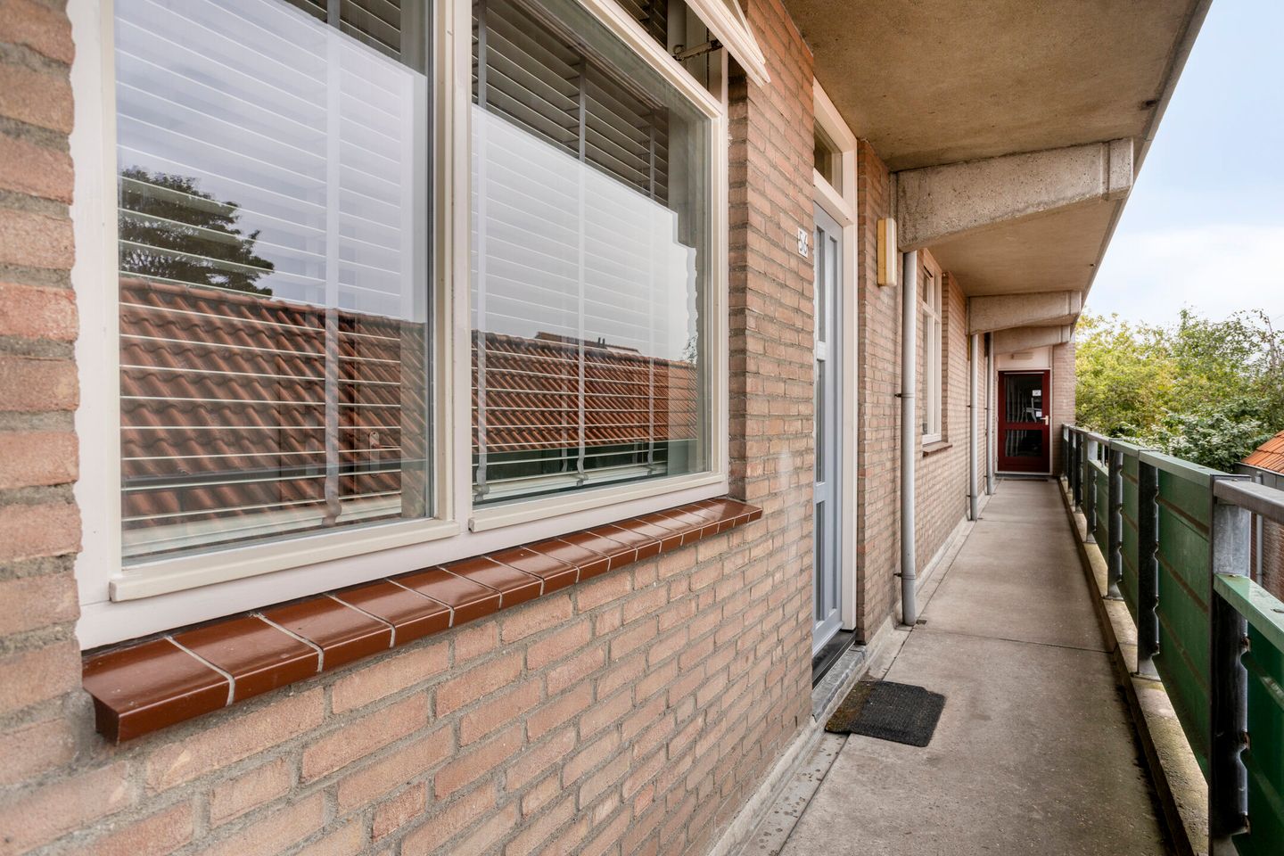 Aan de voorzijde van de woning bevinden zich de betegelde badkamer, uitgerust met toilet, wastafel en douche, en de slaapkamer. Het appartement is afgewerkt met een laminaatvloer, stucwerk wandafwerking en een spuitwerkplafond. De voordeur is recent (2024) vervangen en uitgevoerd in onderhoudsvriendelijk kunststof.